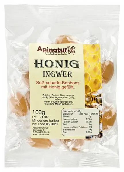 Zutaten: Zucker, Glukosesirup, Honig (9 %), Ingwerpulver (1 %), Aroma. Kann Spuren von Sesam, Malz und Milch enthalten.